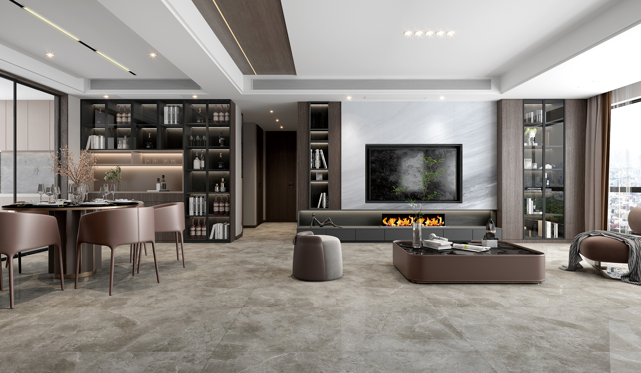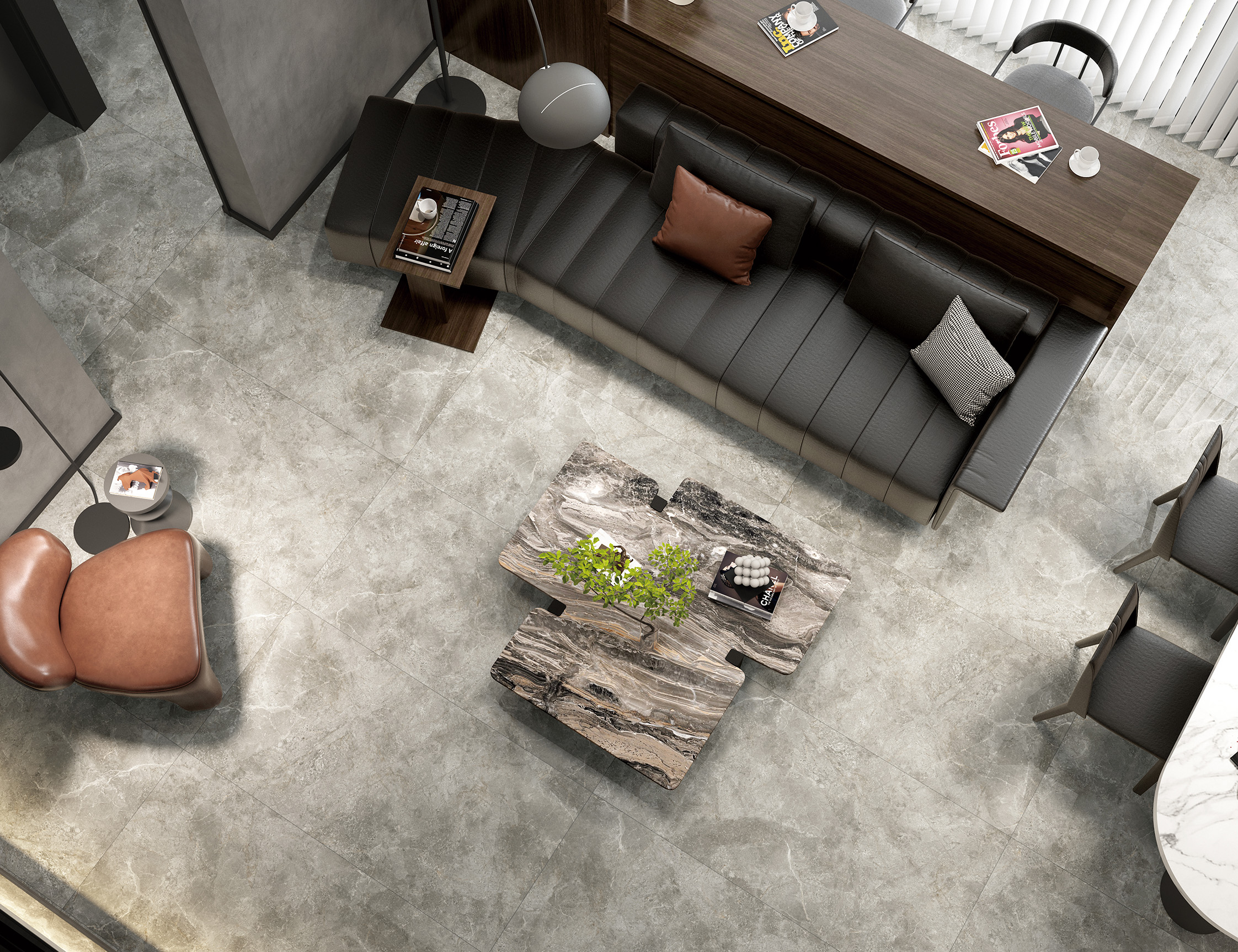 卡基諾灰,遍布粗糲的原石顆粒,層次立現(xiàn),承載悠遠時光感的黑色細紋在磚的表面盛放,訴說著大理石億萬年自然演變的原始記憶。一石滿足多種應用需求,即可以高調奢華也可以低調優(yōu)雅,裝點出簡約時尚的生活空間。
